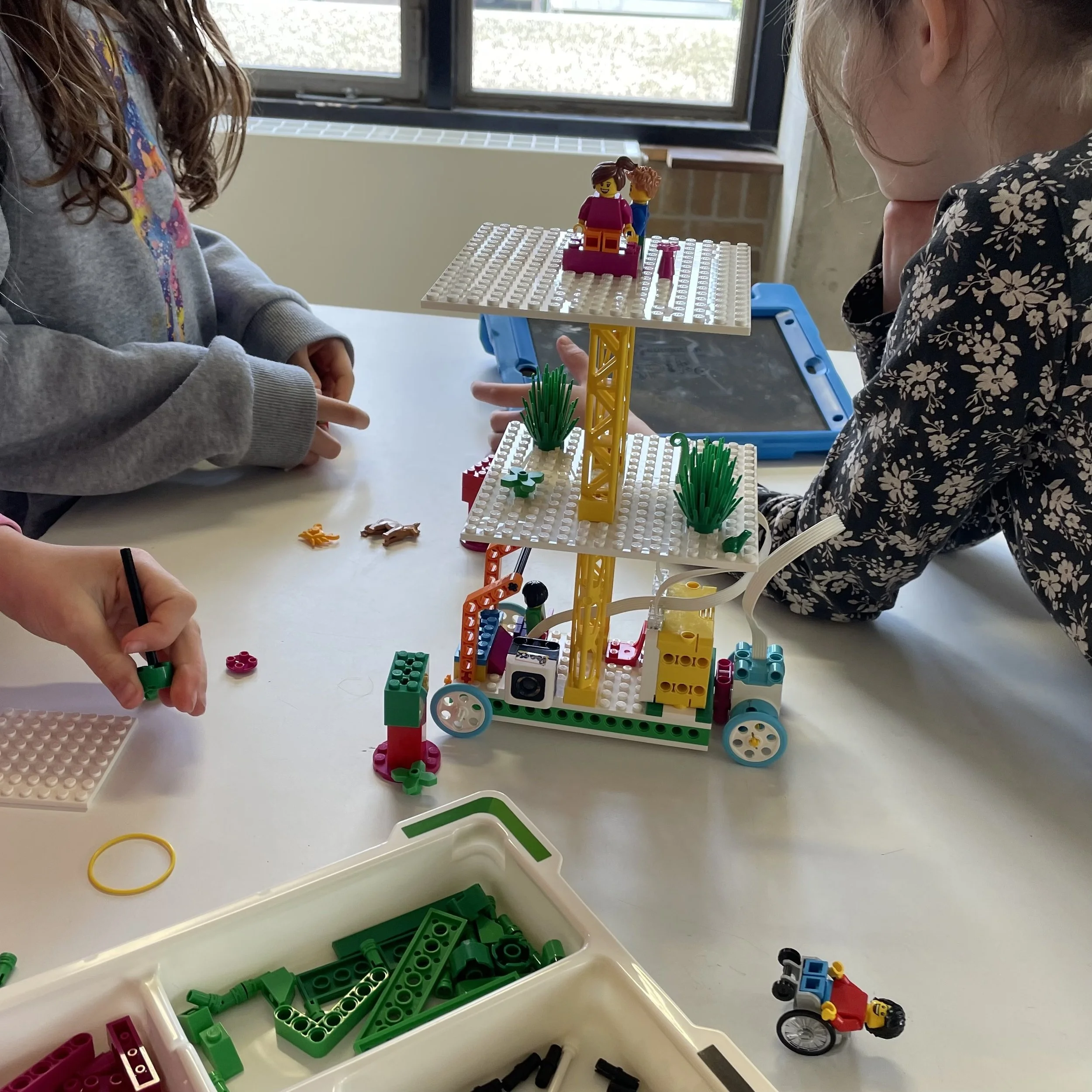 De kinderen bouwen samen één robot met LEGO® SPIKE™ Essential robotsets en ontdekken hoe motoren en sensoren samenwerken.